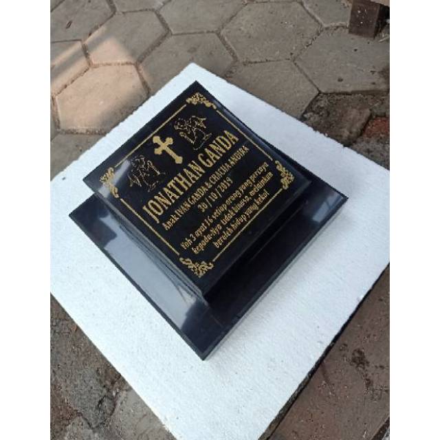 Batu nisan kristen ukuran 40x30 cm, bahan granit hitam tebal 1,8 cm, tulisan tinta emas, wa.