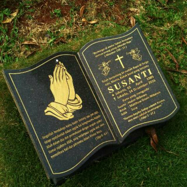Sedangkan untuk harga batu nisan sangat bervariatif tergantung dari bahan batu nisan yang digunakan serta ukuran batu nisan. Berbagai jenis contoh batu nisan terbaru. Itulah penjelasan mengenai ayat alkitab tentang kematian manusia serta orang yang sudah meninggal dunia, batu nisan, ayat alkitab. Model bentuknya pun juga bervariasi banyak pilihannya tidak monoton, bahkan anda juga bisa request bentuknya. Kata mutiara di batu nisan kristen 081286354441 kancil nisan membantu anda dalam memenuhi keinginan pembuatan batu nisan info. Batu nisan kristen ukuran 40x30 cm, bahan granit hitam tebal 1,8 cm, tulisan tinta emas, wa. Dapatkan harga terbaik dengan klik tombol minta penawaran ! Berbagai jenis batu marmer dan granit. Batu nisan model buku, batu nisan salip, batu nisan minimalis, kijing batu nisan, nisan batu granit, nisan batu alam untuk papan nama almarhum menggunakan batu granit warna hitam. Kami menerima pesanan pembuatan plakat prasasti batu nisan untuk makam kuburan. Produksi batu nisan kami sudah tersebar di beberapa kota di indonesia. Contoh batu nisan katolik_ nisan katolik diatas termasuk model bongpay kristen dengan penulisan seperti diatas. Menjual patung malaikat angel untuk pemakaman, pertamanan.pengalaman kami di bidang batu alam ini sudah 16 ingin beli produk plakat nisan kristen ?
